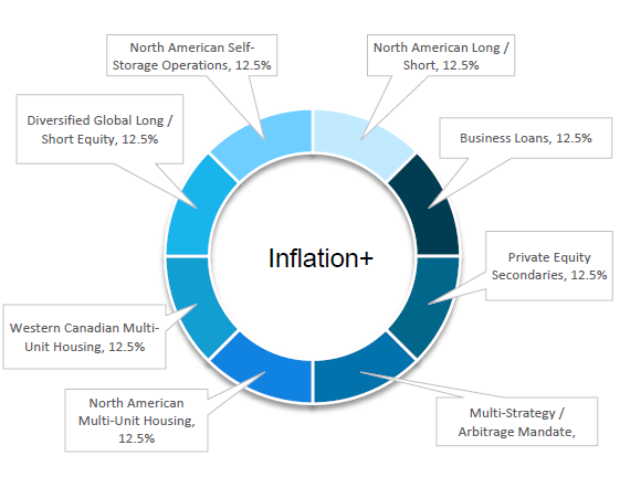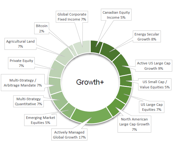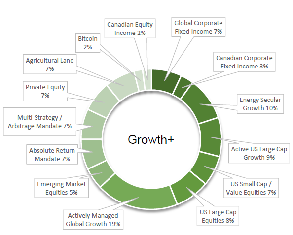 The 50% Growth+ / 50% Inflation+ Portfolio combines the Growth+ strategy's global investing themes with the Inflation+ strategy's focus on low volatility growth and inflation protection. Investors enjoy diversified exposure that aims to benefit from both growth opportunities and a hedge against inflation. With a medium risk level, this portfolio seeks to strike a balance between capital appreciation and protection, making it a dynamic choice for investors navigating changing economic landscapes.